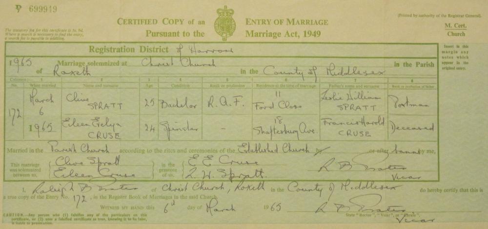| 28 | "Marriage Cert 1965 Clive Spratt & Eileen Evelyn Cruse, Christ Church, Roxeth, Harrow, Middlesex". |