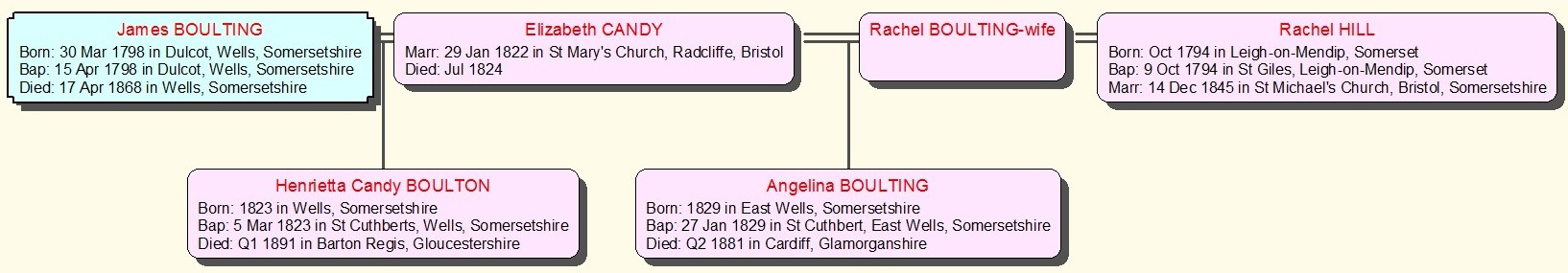 Some researchers believe that Rachel Cromblehome, nee Hill was the mother of James Boulting's second daughter Angelina and his son James. In the 1841 Census he is shown with a Rachel and the three children, who were aged 18, 12 and 9 years old. But if Rachel Hill was their mother why did they wait until 1845 to marry? James's first wife Elizabeth Candy died in 1824; Rachel Cromblehome's husband Thomas also died in 1824; they were both free to marry, so why wait? I think that he remarried another Rachel before Angelina was born in 1829 and his second wife died between 1841 and 1845, but will be happy to hear from anyone who knows better. |