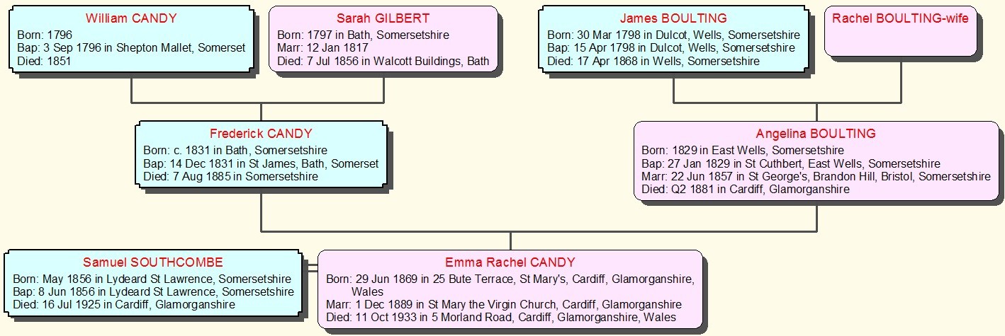 Emma Rachel Candy was Clive's grandmother, she was born in Cardiff, south Wales in 1869, but the earlier family came from Somerset. Frederick Candy was a mariner when he married Angelina Boulton in Bristol, which was an important city for seafarers. The spelling of the name Boulting was sometimes Boultin or Boulton, probably down to the individual spelling of the parish clerk. Emma Rachel Candy had a brother Frederick William Candy and a sister Angelina, both born in Bath, Somerset, and another sister Eliza Jessie born in Cardiff in 1864 - so the family moved to Cardiff between 1859 and 1864. Most of the Candy's were pork butchers, and Clive's grandmother Emma Rachel Candy also had an interest in the trade when she lived in the Roath area of Cardiff; in the 1901 Census she was described as a 'Butcher, on own account'. |