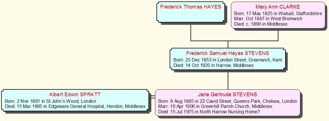This is the Stevens line back to Frederick Thomas Hayes, for whom we only have an estimated date of birth and only know his name from his son's birth certificate. Our Stevens line has been a puzzle for some time as we could not find the parents of Frederick Samuel Hayes STEVENS, but we have recently found that he was registered at birth as Frederick Samuel Hayes and added STEVENS as his surname, possibly after his father died and his mother married again; there is still more work to do, but at least we now know his mothers details. His five siblings did not take the new surname. |