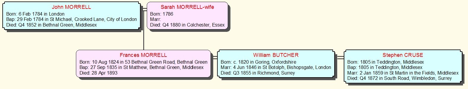 Eileen is descended from the second marriage of Frances Butcher, nee Morrell. All we know about the Morrell's is that John was a greengrocer when daughter Frances married William Butcher, and she was living in Wimbledon, Surrey at the time of her marriage. |