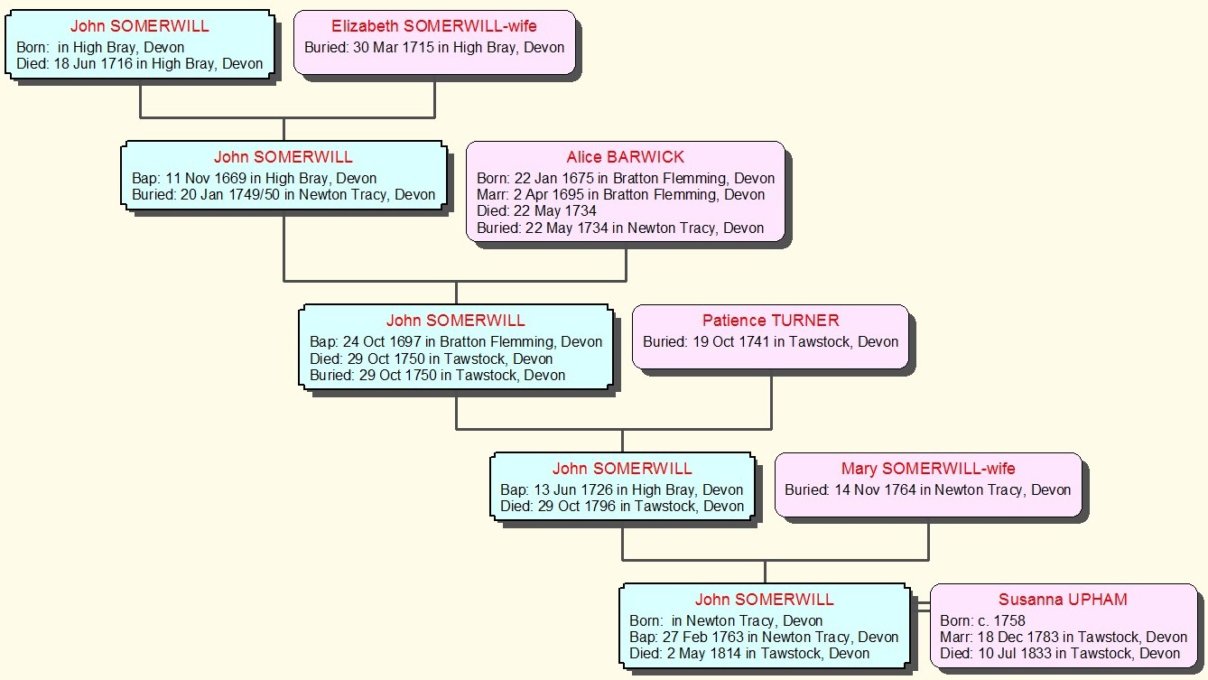 After that the family moved to Tawstock where son John married Susanna Upham on 18th December 1773. John and Susannah had eleven children survive into adulthood, and it is from their third son George who married Frances Norman in Exeter in 1820 that Eileen Cruse is descended. We have no more details for Susanna Upham, but there is a possible candiate for Susanna born in Offwell to be investigated. When George Somerwill arrived in Exeter he was a Basket Maker and lived in Fore Street, this is probably where he met his wife Frances. They had twelve children, including John Upham Somerwill who later still moved to London and the name changed to Somerville, possibly because that was what was heard in a broad Devon accent.