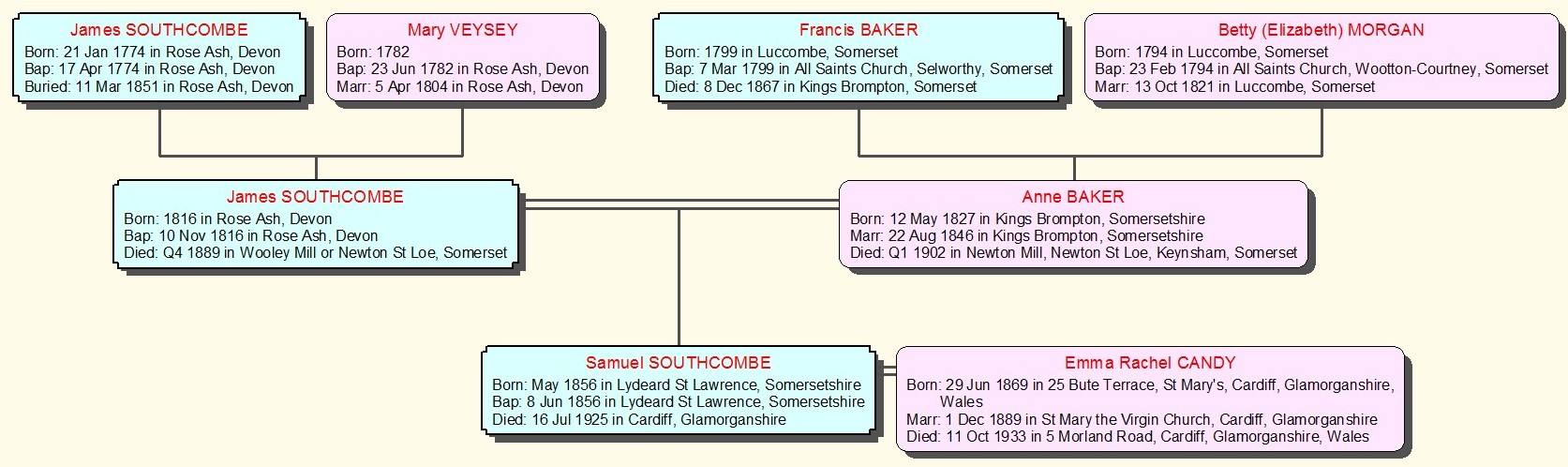 Mary Veysey was the most likely candidate for the marriage to James Southcombe, but we will be happy to hear from anyone who knows for certain. Anne Baker came from Kings Brompton in Somerset, (otherwise known as Brompton Regis). Her parents were Francis & Betty Baker nee Morgan,. Most of the records we have searched for this family are held on microfiche in the Devon Record Office in Castle Street, Exeter, which is conveniently close to the West Country Studies Library. |
