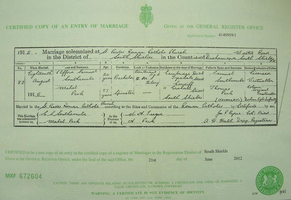 | 22 | "Marriage Cert 1915 Clifford Samuel Southcombe & Mabel Agnes Peck". |