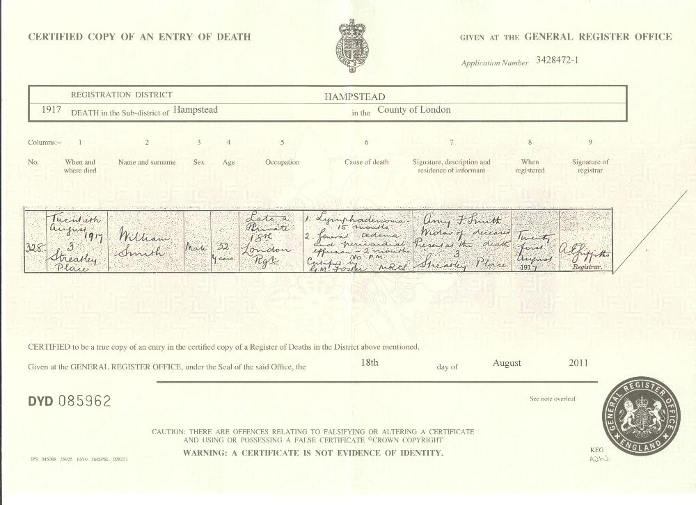 | 8 | "Death Cert 1917 Smith William, Hampstead, County of London". |