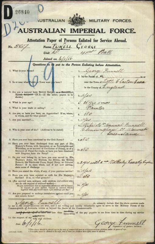 | Service | 16 Jan 1916 (age 35-36) | Served in A.I.F, 41st Battalion, Private No. 867 |