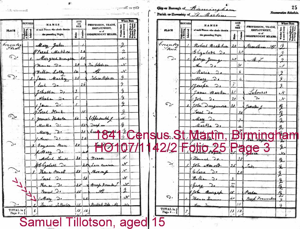 1 | "1841 Census Tillotson Samuel, St Martin's, Birmingham". |