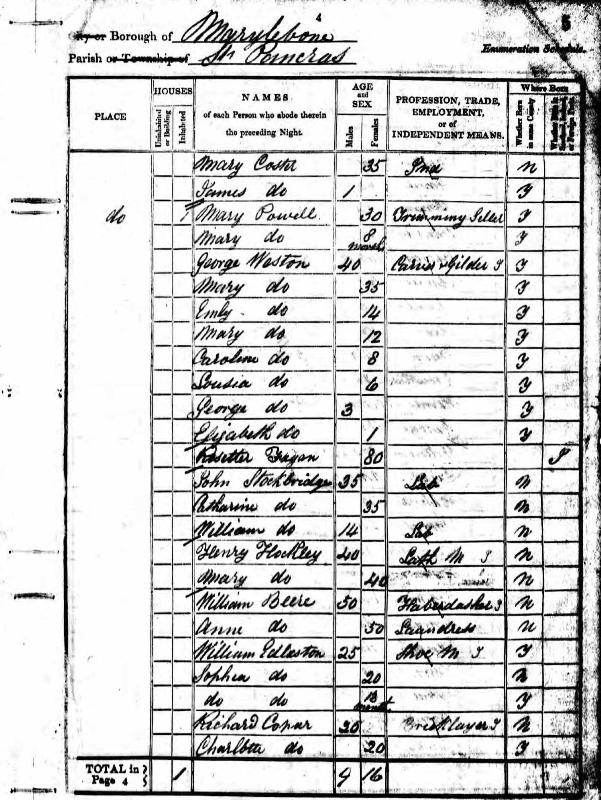 | 2 | "1851 Census Weston George & family, St Pancras, Middlesex HO107 1494 Folio 784 Page 19 Sch 86 George Weston, Head, M, 54, Carver & Gilder, b. London Mary Weston, wife, M, 47, b. Oxfordshire, Upper Farron? Louisa Weston, 15, b. London George Weston, 13, b. London Elizabeth Weston, 10, b. London James Weston, 7, b. London Richard Weston, 3, b. London". |